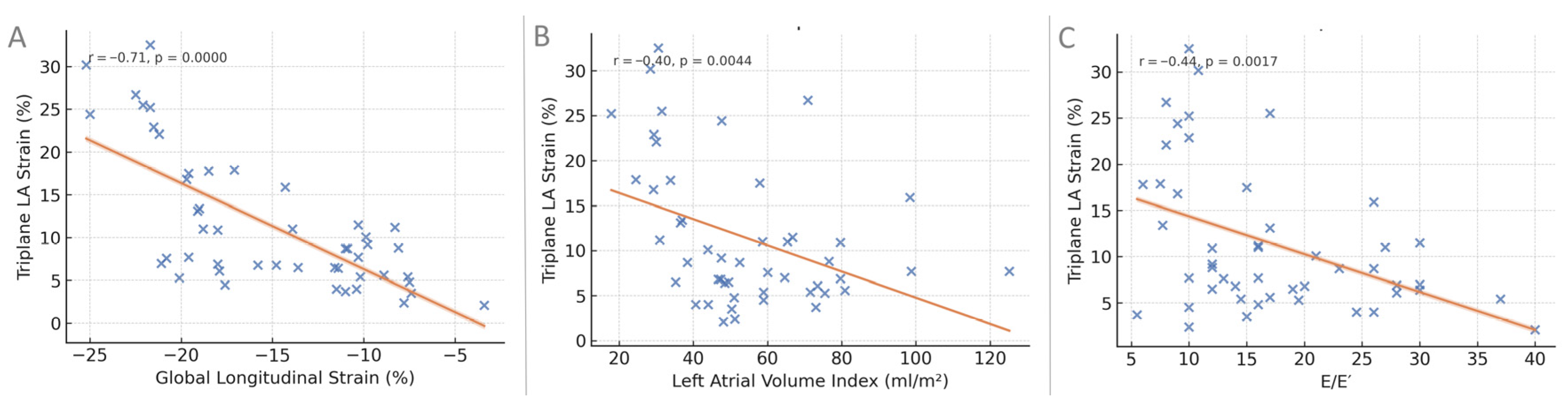 Correlation of triplane LA reservoir strain with selected echocardiographic parameters. (A) Relationship between triplane LA reservoir strain and left ventricular global longitudinal strain. (B) Relationship between triplane LA reservoir strain and left atrial volume index. (C) Relationship between triplane LA reservoir strain and the E/E′ ratio. In each panel, blue dots represent individual patients and the orange line indicates the linear regression fit.