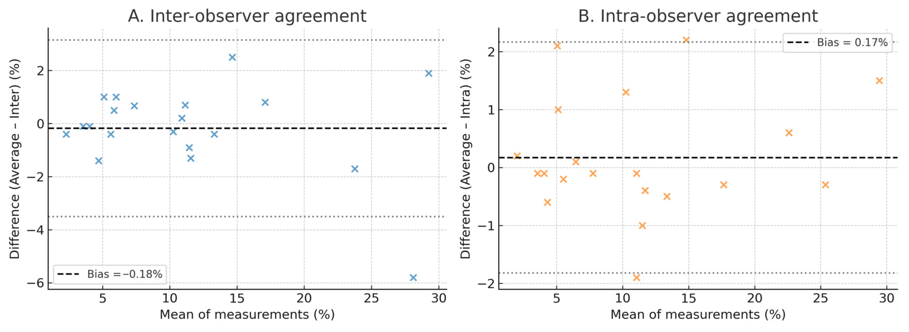 | Controls, n = 10 | Intra-observer | 10 | 0.99 | 0.55 | −1.71 to +2.81 | 0.82 | 5.2 | 15.8 |