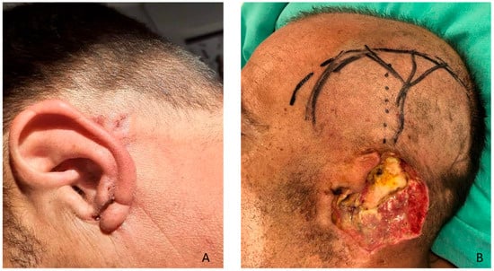 (A) Initial tumor lesion. (B) After radical excision with histologically verified clear resection margins. Temporalis muscle flip flap was designed to cover the large defect, including the exposed mastoid bone.