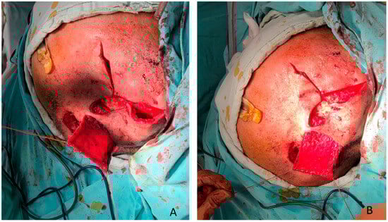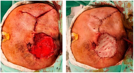 (A,B) Temporalis muscle flip flap covering the exposed bone.