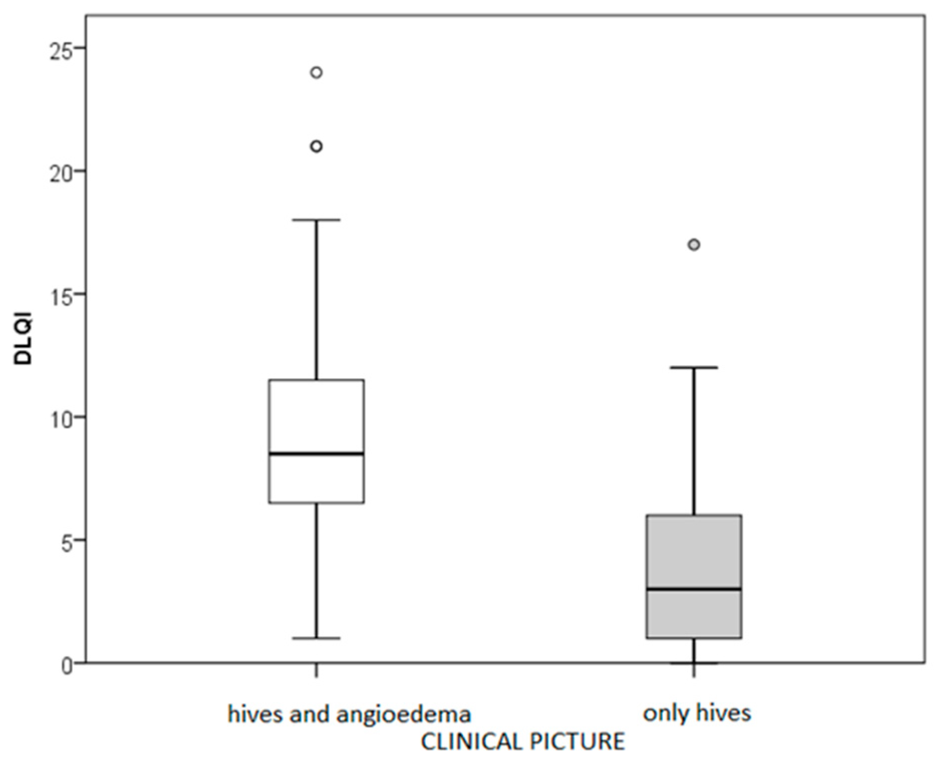 - Kuna, M.; Štefanović, M.; Ladika Davidović, B.; Mandušić, N.; Birkić Belanović, I.; Lugović-Mihić, L. Chronic urticaria biomarkers IL-6, ESR and CRP in correlation with disease severity and patient quality of life-a pilot study. Biomedicines 2023, 11, 2232. [Google Scholar] [CrossRef]