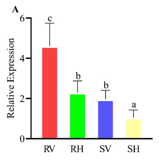 Effects of ToCV on genes related to three detoxification enzymes. RV, resistant veneniferous B. tabaci MED; RH, resistant healthy B. tabaci MED; SV, sensitive veneniferous B. tabaci MED; SH, sensitive healthy B. tabaci MED. Data represent mean ± SE (n = 3). (A) Effects of ToCV on the upstream regulators of the CYP6CX4 gene. (B) Effects of ToCV on the upstream regulators of the GSTs2 gene. (C) Effects of ToCV on the upstream regulators of the LOC109038667 gene. Different uppercase letters above bars indicate significant differences (Tukey’s HSD with α = 0.05).