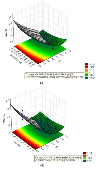 Zn, mg/L = 34.707 − 5.890 [pH] + 0.274 [pH]2 − 129.512 [V Na2CS3] + 1504.599 [V Na2CS3]2 − 0.031 [Time] + 0.001 [Time]2