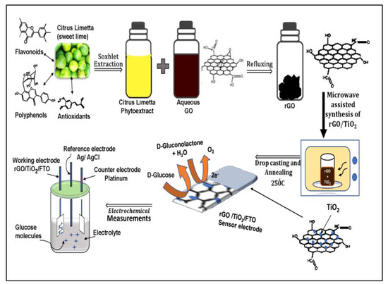 In the case of green reduction, a study of suitable phytochemicals as reducing agents is necessary. Additionally, a green reduction is a simple, eco-friendly, and cost-effective method. In light of this motivation, the work that is being proposed provides an environmentally friendly reduction of GO using Citrus limetta (sweet lime/Mosambi fruit waste) and TiO2 electrodes for electrochemical glucose sensing that does not require enzymes. Green reduction and bio-synthesis routes are employed to overcome the adverse effects of hazardous substances, where phytoextracts or bacteria microorganisms play eco-friendly (for reduction) and capping agent roles [,,]. A germ-free environment is necessary to grow micro-organisms, and also expertise is needed in this process. The reduction of GO can be done using citrus plant extract, which has a slower reaction rate to control the crystal growth. In the past, the green synthesis of reduced graphene oxide (rGO) has been studied using several plants and fruit extracts []. The green nature, low cost, and easy local availability of plant extracts and fruit wastes make them suitable for reduced graphene oxide. Citrus limetta is the primary natural source of vitamin C and an energy booster []. Fruit peels of sweet lime are a waste to the juice industry, an important source of phytochemicals like flavonoids, pectins, carotenoids, hesperidin, terpineol alkaloids, essential oils, d-limonene, and extraordinary antioxidants as well as antibacterial properties []. Graphene obtained via the green reduction process can be functionalized with metal oxides for various applications including electrochemical supercapacitors, batteries, fuel cells, magnetic data storage, water splitting, chemical sensors, water filters, dye removal, and dye-sensitized solar cells, etc. [,,,].