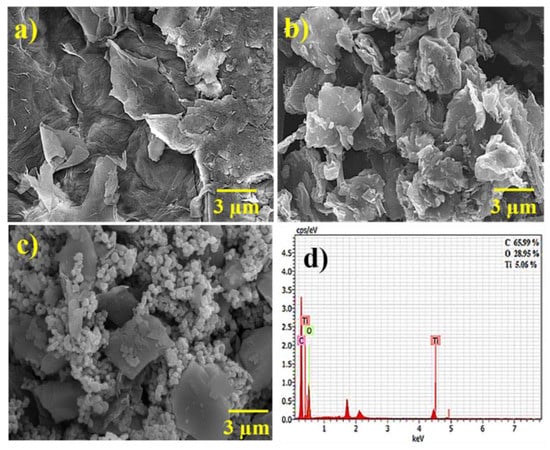 FE-SEM images of; (a) GO, (b) rGO, (c) rGO/TiO2, and (d) EDS spectrum of rGO/TiO2.
