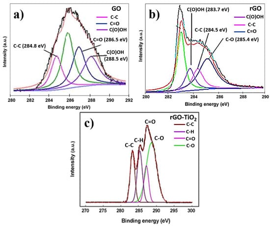 Figure 4a–c displays the XPS spectrum of the C1s spectrum of GO, rGO, and rGO/TiO2. The peak in Figure 4a that corresponds to the C1s bands in deconvoluted GO into C-C, C=O, and C(O)OH bonds, respectively, has binding energies of 284.8, 286.5, and 288.5 eV []. When compared to GO, the C=O and C(O)OH bands of the rGO C1s spectrum show a marked decrease in intensity, indicating that rGO has undergone deoxygenation. However, as shown in Figure 4b, after being reduced, the peak oxygen intensity with functionalities is sharply reduced. These results have demonstrated the decrease in GO. The C-C, C=O, and C(O)OH bonds, respectively, are ascribed to the peaks with binding energies of 284.5, 285.4, and 283.7 eV that correspond to the C1s bands in deconvoluted rGO. The variation in the chemical surrounding of carbon atoms after reduction may cause a shift in binding energy []. Additionally, the surface C/O atomic ratios increased from 2.12 to 5.57, validating the successful removal of O2 groups from the GO surface using aqueous peel extract of citrus limetta. In Figure 4c, three peaks found in the C1s deconvoluted spectrum of rGO/TiO2 are for C-C/C-H sp3 hybridized carbon bonds, C-O bonds, and the sp2 carbon bonds of graphene (c), respectively.