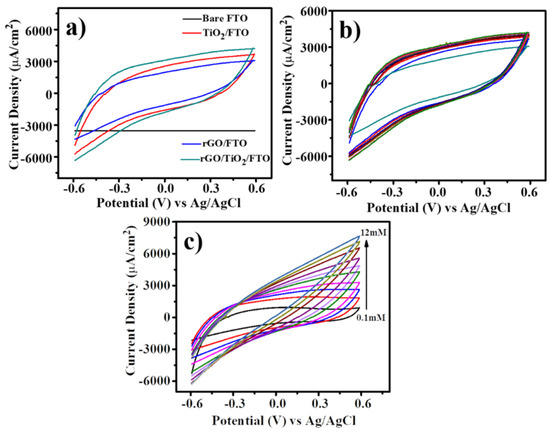 Consequently, it is confirmed that the rGO/TiO2/FTO composite is essential for obtaining increased sensitivity and electrocatalytic activity. A further investigation into the electrochemical effect on rGO/TiO2/FTO with variable scan rate was carried out using CV which is illustrated in Figure 5b. The electrode was scanned between 10 and 300 mV/s in an electrolyte containing 2 mM D (+) glucose using a CV between −0.6 V and +0.6 V. Regarding current flow, the oxidation that took place at −0.25 V is the most notable. that the rGO/TiO2 nanocomposite undergoes an electrochemical reaction, demonstrating the enzyme detection capability. Furthermore, electrochemical measurements were carried out at the optimal potential of −0.25 V vs. Ag/AgCl, which was optimal.