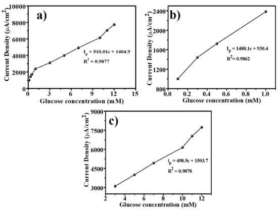 The calibration curves for various glucose concentration rage are presented in Figure 6. A calibration curve for glucose concentrations in 0.1 to 12 mM is presented in Figure 6a. This curve can be divided into two linear glucose concentration ranges: 0.1–1 mM and 2–12 mM, as presented in Figure 6b,c. For the calibration curve (0.1–1 mM), the equivalent linear regression equations are Ip = 1488.1c + 930.4 and R² = 0.9862 (N = 4). The sensor’s sensitivity determined from the slope of the graph is 1425 µA/cm2 (S/N < 3). For the calibration curve (2–12 mM) the equations are Ip = 498.5c + 1503.7 and R² = 0.9878 (N = 6). The sensor’s sensitivity determined from the slope of the graph is 491.75 µA/cm2 (S/N < 3).
