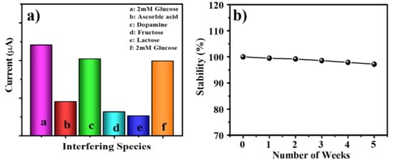 The proposed biosensor was examined for interfering species in blood serum, including ascorbic acid, dopamine, fructose, and lactose. The selectivity of the rGO/TiO2/FTO sensor electrode is shown in Figure 7a. The sample’s stability (aging effect) tested periodically for 30 days with a 1 mM glucose concentration, yielding an RSD of 1.14%, is presented in Figure 7b. For ten cycles, the sensor electrode’s reproducibility was investigated. To observe the current response of each sensor, 2 mM of glucose concentration was used. The RSD of 1.3% confirms the significant reproducibility.