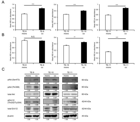 The signaling pathways activated in ESCC cells following direct co-culture with macrophages were then investigated using Western blot analysis. Direct co-culture with macrophages increased the phosphorylation levels of Erk1/2 in TE-9, -10, and -11 cells, in addition to the previously reported enhancement of Akt phosphorylation (Figure 1C and Figure S7A).