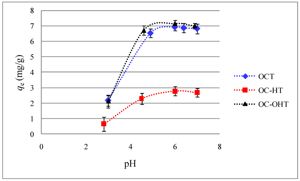 The pH of the aqueous solution is an important controlling parameter in the heavy metal adsorption process because the surface charge density of the adsorbent and the metallic species depend on the hydrogen ion concentration []. Thus the role of the pH was studied from solutions at different pH, covering a range of 3.0-7.0 for the three different materials (OCT, OC-HT and OC-OHT). In these experiments, only the non-fractionated materials were used, at a dose of 1g/L. The concentration of Zn(II) used in those experiments was 10 mg/L and the room temperature was 25°C. The effect of solution pH on Zn(II) sorption is shown in Figure 3.