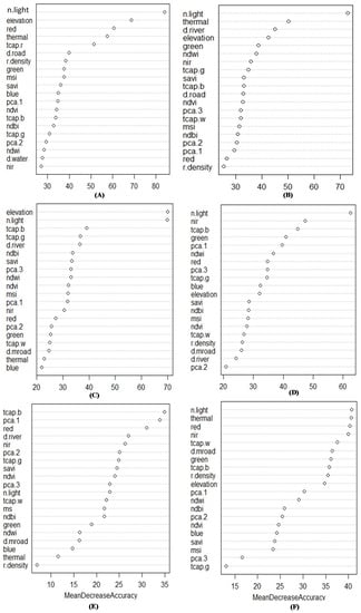 If the number of variables is too large, as is often the case for multi-source studies, a RF can be applied only to those variables that have been identified as the most important and that contribute most to increased accuracy [45,53]. As a result, we calibrated our model based on a complete dataset, then used the variable importance results to tune parameter settings such as increasing the number of mtry. Using backward elimination processes, we curtailed the least important variables that were ranked far down the list of the variables of importance graph (Figure 2) [48]. In this way, the final RF models were developed based on a reduced number of datasets for every single period of image classification. As a large number of trees is recommended when using RF algorithms to stabilize the Mean Squared Error over many iterations [50,54], in each iteration process, the RF algorithm was run to grow 2000 trees with five to six of the 20 explanatory variables randomly selected at each node as potential variables to base the split on.