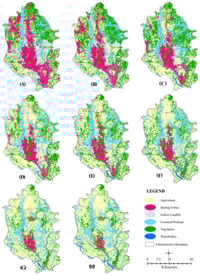 Land cover map of the Core city/Dhaka City Corporation area (DCC) between 1972 and 2015. (A) 2015; (B) 2010; (C) 2005; (D) 2000; (E) 1995; (F) 1990; (G) 1980; (H) 1972.