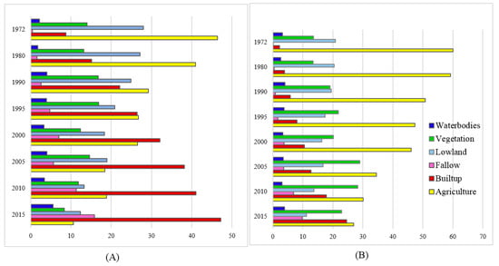 The proportional distribution (%) of each land cover class in eight periods. (A) Core city area/Dhaka City Corporation area and (B) whole study area.