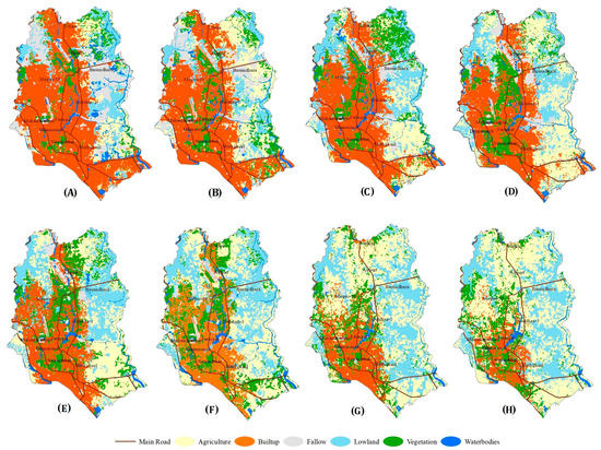 Spatiotemporal distribution of land covers and patterns of urbanization in greater Dhaka from 1972 to 2015: (A) 2015; (B) 2010; (C) 2005; (D) 2000; (E) 1995; (F) 1990; (G) 1980; (H) 1972.