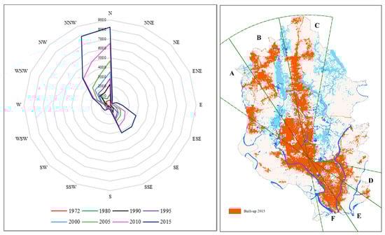 The spider diagram on the left represents spatial patterns of urban growth trajectories (in hectares) in 16 directions between 1972 and 2015. The map on the right shows recent urban growth trends in six major corridors. (A) Dhaka–Aricha Highway; (B) Savar–Ashluia–Baipayl; (C) Tongi–Gazipur along the Dhaka–Maymenshing Highway; (D) Dhaka–Chittagong Highway; (E) Dhaka–Narayanganj Road; and (F) Dhaka–Narayangang–Munshiganj corridors.