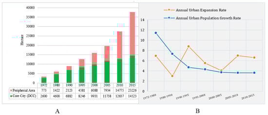 The bar chart on the left (A) compares total built-up area between the core city (DCC) and the peripheral area and the line graph on the right (B) compares annual urban expansion rate (%) with annual urban population growth rate (%) from 1972 to 2015.