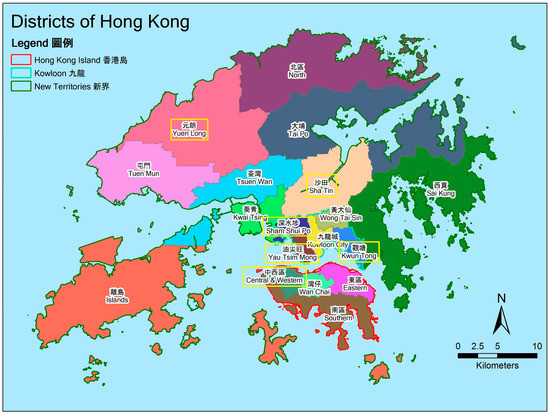 The sampled locations included six different districts in Hong Kong. These districts, as indicated in Figure 1, are located in both urban residential areas (Central and Western District, Kwun Tong, Sham Shui Po and Yau Tsim Mong) and new towns sites (Shatin and Yuen Long). Some of these districts are characterized by their roles and histories in Hong Kong, for example, Central and Western District is the central business district with more affluent groups of populations; Kwun Tong, Yuen Long and Sham Shui Po have a relatively large percentage of ethnic minorities and new immigrants; Yau Tsim Mong is the core urbanized area; and Shatin is the first and the largest new town in the territory.