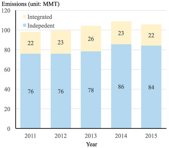 Figure 1 shows the total carbon emissions from onshore and offshore oil/gas production for 2011–2015. The data are extracted and compiled from the EPA’s GHG Reporting Program (GHGRP), which monitors the facilities emitting more than 25,000 metric tons of CO2e per year (Link to GHGRP: https://www.epa.gov/ghgreporting, accessed on 20 September 2017). The left panel depicts the emissions by production sites. The right panel indicates the top 15 emitting companies. We can see that production is concentrated in several states/regions, most notably in Texas, Oklahoma, and the Mexican Gulf. The biggest emitting producer is Conoco Phillips (Houston, TX, USA), which emits significantly more carbon than the second one, ExxonMobil Corporation (Irving, TX, USA). Both Conoco Phillips (Houston, TX, USA) and ExxonMobil (Irving, TX, USA) are integrated companies that engage in exploration, production, refinement and distribution. Chesapeake Energy Corporation (Oklahoma City, OK, USA), an independent producer, comes at the third place, emitting 24.1 MMT. While on average the integrated companies generate more carbon emissions than independent producers, the overall emissions from independent producers are larger. Figure 2 shows the annual emissions from integrated and independent companies in the upstream production sector from 2011 to 2015, with data obtained from GHGRP. The figure indicates that independent producers consistently generate more than three quarters of the total emissions in the production sector. In this study we focus on the independent producers. Integrated companies (e.g., BP (London, UK), Chevron (San Ramon, CA, USA), Conoco Phillips (Houston, TX, USA), ExxonMobil (Irving, TX, USA)) are excluded from analysis, because their other operations (e.g., refinement and distribution) make it difficult to compare them with independent producers.