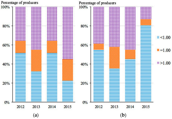 Distribution of the Malmquist indexes per year, 2012–2015. (a) Natural disposability; (b) Managerial disposability.