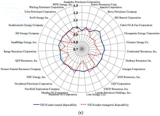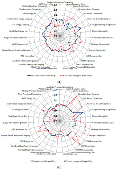 Figure 4 also shows interesting results about the EFF and TECH indexes. The EFF index measures how much closer a producer moves to the efficiency frontier over time. The TECH index measures the frontier shift caused by technical change. Panel (b) shows that under natural disposability, almost all producers have EFF close to one except Chesapeake Energy Corporation. The high EFF of Chesapeake indicates that the company has made significant progresses in catching up with efficient companies on the frontier. Meanwhile, its TECH is close to one. Hence, the company’s growth in eco-productivity is driven by its ability to catch up the frontier, rather than the industry-wide technical change. Under managerial disposability, the EFF indexes display wider variations. Panel (c) shows that under natural disposability, the TECH indexes stay close to one and remain relatively stable across the producers. However, under managerial disposability, most of the TECH indexes drop below unity, indicating an industry-wide loss of efficiency in terms of technical change. Among all the producers, EOG Resources (Houston, TX, USA), Linn Energy (Houston, TX, USA) and Southwestern Energy Company (Houston, TX, USA) have the worst TECH indexes.
