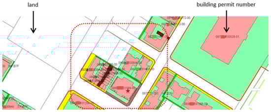 The building design case should be subject to the urban land use zoning and provisions of the Building Act to be convenient for the building design. Therefore, in this research, legal buildings are used as the main research targets. Upon reference to the “building cadastral mapping” system of the competent government building authority (Figure 2), after inquiry of construction permits in all buildings, the building permit data are referred and the design value is logged in.