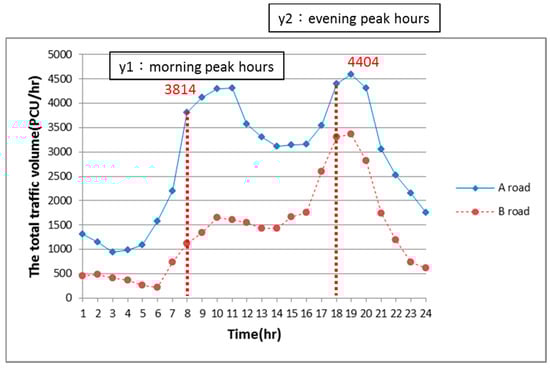 This formula is the passenger car unit (PCU/day) generated at the road crossings in an entire day, where is the morning peak hours (PCU/h) and is the evening peak hours (PCU/h).