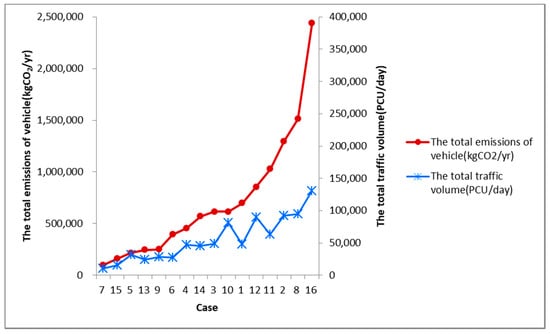 Statistical of the total traffic volume generated and the total CO2 emissions generated by the total number of vehicles.