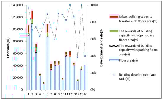 This study conducts in-depth analysis of the relation between traffic volume and building design scale. Regarding building design in this research, due to the applicable factors of award decrees of various floor areas, the ultimate design of the building scale is influenced, thus, this research incorporates the total area of the reward of building capacity with parking, total area of the reward of building capacity with open space and the urban building capacity transfer with floor area (Figure 6) and the result is shown as follows (Table 4).