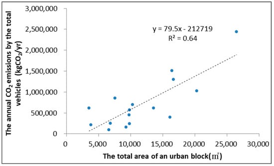 The relation between the total annual CO2 emissions of urban blocks generated by vehicles and the total area of an urban blocks (Figure 7) is as follows: