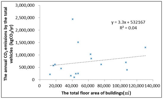 The relation between the total annual CO2 emissions of urban blocks generated by vehicles and the total floor area of buildings (Figure 8) is as follows: