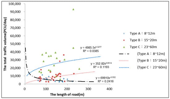 In this research, in order to analyze the road width, as well as the mutual relation between the length of each road in the block and the amount of traveling vehicles generated in the road throughout the day, three road widths are classified (Type A: 8~12 m; Type B: 15~20 m; Type C: 23~60 m). This research found that the relation between the passenger car unit and road length in the three road widths is, the wider the road is, the longer the road and larger the traffic volume will be (Figure 9), thus, there is non-positive correlation for urban roads with a width less than 12 m.