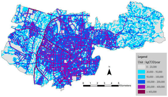 This research constructed a map of the total carbon budget of traffic, buildings and parks in metropolitan Taichung, central Taiwan [19]. Carbon emissions from buildings in the city were estimated according to electricity usage [28,29], e-Question results, a common building type in Taiwan (i.e., residential and commercial mixed-use building) and the energy consumption of low-story and high-story apartments, office buildings, hospitals, educational institutions and other building types. Therefore, the total CO2 emissions from buildings in Taichung were measured according to 15 different building uses, EUI, land types as specified during urban planning and presented in grids of 100 × 100 m and the total floor area, with the estimation results shown in Table 2.