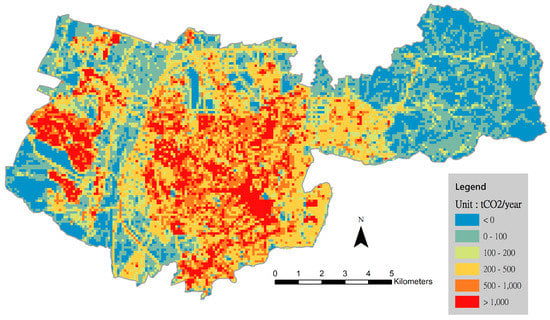 Finally, the total CO2 emissions from traffic and buildings in each 100 × 100 m grid in Taichung were estimated according to the type of land specified and the effects of the city’s carbon sinks (e.g., rivers and parks) on that estimated volume of CO2 emissions were analyzed. On the basis of these results, a carbon budget map for the city was constructed (Figure 12).