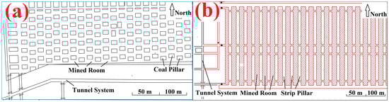 Typical abandoned mines of partial extraction from China: (a) room-and-pillar mine; (b) strip pillar mine. Massive coal pillars and voids are left underground.