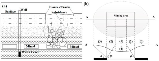 Schematic drawings of (a) localized subsidence due to room-and-pillar collapse and (b) continuous mining subsidence: α stands for boundary angle of subsidence range; φ stands for maximum subsidence angle; and area (1) for uniform subsidence; non-uniform compressive area (2) and tensile area (3).