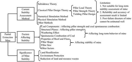 The shortcomings of traditional subsidence theories and pillar design theories have prevented their applications for evaluating the long-term mine stability of partial extraction, making it hard to provide scientific support for land reutilization. Thus, more research is needed to advance assessment methodologies to identify the factors affecting the long-term stability of partial extraction mines. It is believed that the structural planes in pillars and water are the key factors in the long-term stability of abandoned mines. The factors summarized should be considered or be introduced to the existing stability evaluation methods.