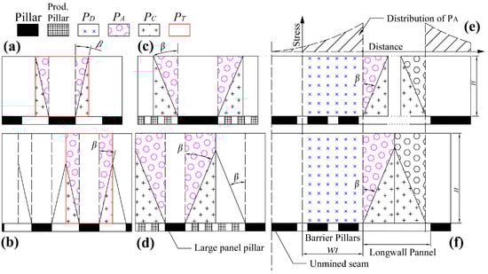 The loads applied to coal pillars include the development loads and the abutment loads, and the latter usually appear near the abutment seams []. Widely-used load theories include pressure arch (PAT), tributary area (TAT) and beam theories [,,]. Figure 4 shows the typical conception of different kinds of loads on pillars. In Figure 4, PA is the abutment load, PC is the load loss due to roof caving or load transfer, and PT is the TAT load. The PAT assumes that an arch will form above the coal seam carrying most of the overburden weights, the coal seam near arch springing will carry PA and the pillars below the arch will carry PC; while TAT assumes that the overburden load is evenly distributed among the pillars, thus, each pillar will carry PT if the rooms are formed (Figure 4a,b), but it may overestimate the stress on the coal pillars [,]. At first, the strata properties were not considered in the load calculation, Heasley [,], Singh et al. [] and Rezaei et al. [] modified the theory and included the mechanical properties of overburden and coal seams, thus improving the accuracy of pillar stress estimation.