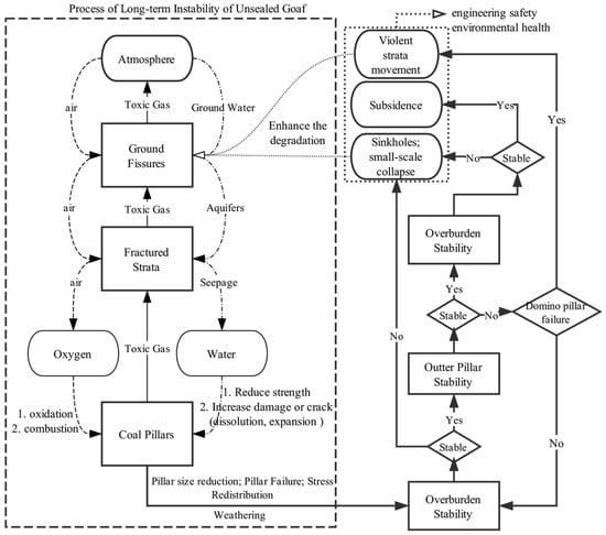 Finally, the spontaneous combustion of coal should be considered. Since coal can absorb oxygen when the temperature exceeds −80 °C, the heat will be released, and the temperature will increase during oxygen absorption []. If the temperature exceeds 50 °C, the chemical absorption of oxygen will become significant, and unstable hydrocarbon–oxygen complexes (work within the range of 50–120 °C) will form, and the chemical activities of coal will be enhanced []. If the heat accumulation rate is larger than the heat emanation rate, the temperature and the chemical reaction between coal and oxygen will increase drastically beyond the ignition point of the coal and combustion will occur. Hence, to evaluate the possibility of spontaneous combustion, the oxidation properties of coal (including the oxidation effects on combustion and strength degradation), the air circulation condition and the temperature field of the abandoned mines should be investigated first. Whether the combustion of residual pillars is a long-term threat to the safety of land use should be clear.