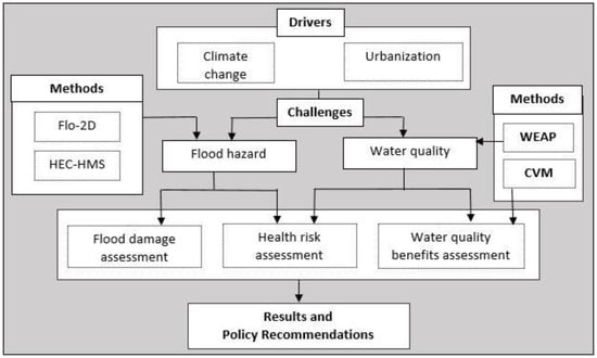 Systems analysis approach undertaken by the UNU-IAS research group in the current study (Flo-2D—Hydrologic and Hydraulic Modelling System; HEC-HMS—Hydrologic Modelling System; WEAP—Water Evaluation and Planning System; CVM—Contingent Valuation Method).