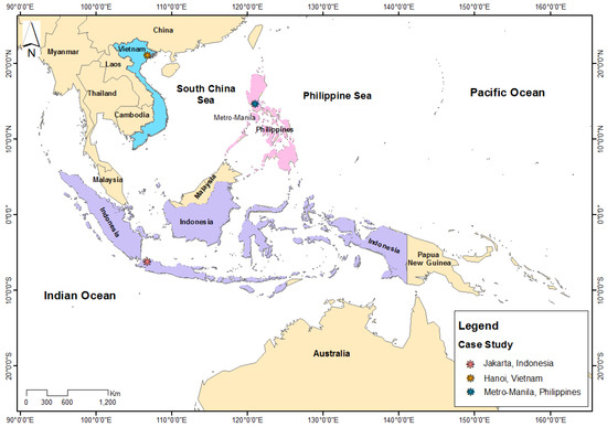 The growing recognition of complexity requires the need for systems approaches to solve issues in urban water management. Integrated systems approaches involve interdisciplinarity, as complex city infrastructures comprise intersecting diverse natural, technical, and institutional dimensions [31]. Therefore, properly understanding these issues and the ways to solve them requires researchers and professionals from different academic and professional disciplines to provide input, exchange opinions, and learn from each other to discover new, creative solutions. In this work, an integrated approach is applied to interrelate the abovementioned four services of urban water management (Figure 1). Here, this approach is applied to three focus cities in Southeast Asian countries: Metro Manila, Philippines; Hanoi, Vietnam; and Jakarta, Indonesia (Figure 2).