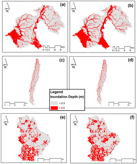 Spatial distribution of inundation depth. (a) Current situation without the effect of climate change in Metro Manila; (b) Future situation with the effect of climate change in Metro Manila; (c) Current situation without the effect of climate change in Jakarta; (d) Future situation with the effect of climate change in Jakarta; (e) Current situation without the effect of climate change in Hanoi; (f) Future situation with the effect of climate change in Hanoi.