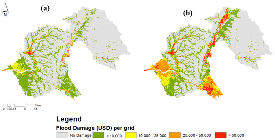 Spatial distribution of flood damage (Marikina–Pasig–San Juan River, Metro Manila). (a) Current situation without the effect of climate change; (b) Future situation with the effect of climate change.