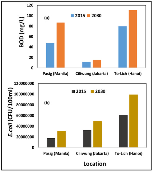 The simulation results of the average values of (a) biochemical oxygen demand (BOD) and (b) E. coli for the entire stretch of each river investigated at the annual scale for the years 2015 and 2030 including the effect of population growth and climate change considering MRI-CGCM with RCP8.5.