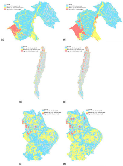 The effects of urban flooding and water quality deterioration, which are affected by both climate change and urbanization (population increase and land use change), on public health were examined by using the risk of infectious gastroenteritis by noroviruses in floodwater as a reference. Our health risk assessment model simulated the probability of infection, as well as the number of infected people among residents in flooded areas, using the results of the flood simulation model and the water quality simulation model. Figure 6 shows the distribution of norovirus infections in flooded areas in Manila under current and future scenarios. High-risk areas (red areas in Figure 7a,b) are more clustered in the southwestern area of the simulated region, compared to the highly inundated areas (red areas in Figure 6), which are also spread in the upstream region, because the southwestern region of Metro Manila has a much larger population than other areas. The high risk areas in Jakarta (Figure 7c,d) and Hanoi (Figure 7e,f) also clustered in populated regions, both in the northern part. Our simulation results also highlighted high-risk areas in terms of waterborne infectious diseases following flooding events, which are located in populated areas, and where severe inundation is expected.