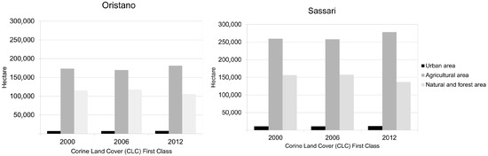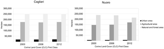 | Nuoro | Agro-forestry areas | Pasture wooded | 4 | +5.00% | Sassari | Mixed forest | Mixed forest | 7 | +10.44% |