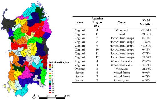 | Area | Corine Categories—3 Level | Crops | Agrarian Area RA | VAM Variation | Area | Corine Categories—3 Level | Crops | Agrarian Area RA | VAM Variation |