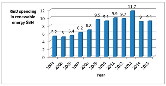 Research and development (R&D) spending in renewable energy, 2004–2015, $BN. Source: Bloomberg, Bloomberg New Energy Finance, IEA, IMF, various government agencies.