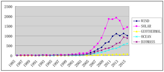 Figure 3 shows the total number of State Intellectual Property Office of the Peoples’ Republic of China (SIPO) patent applications for five renewable energy sources. The patent applications for the five sources grew dramatically since China promulgated the Renewable Energy Law in 2005, however, the growth rate was very slow from 1985 to 2004. Solar applications were the highest, followed by wind applications, and biomass, ocean and geothermal applications took the third, the fourth and the fifth respectively. Solar applications reached the peak value in 2012, then started to fall off in 2013 and 2014, and rebounded in 2015. By comparison, wind applications reached the peak value in 2014, then decreased in 2015. Meanwhile, biomass and ocean have risen steadily particularly since 2005. The patents for geothermal energy is relatively small, but it has been also increasing.