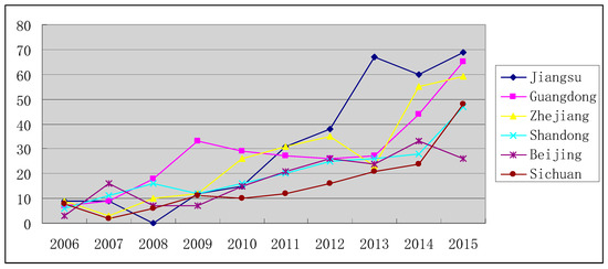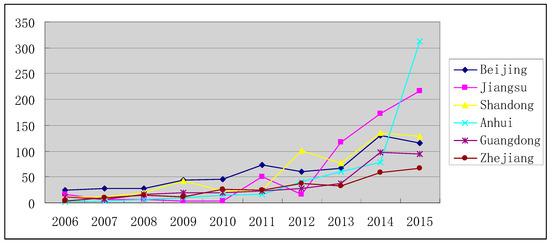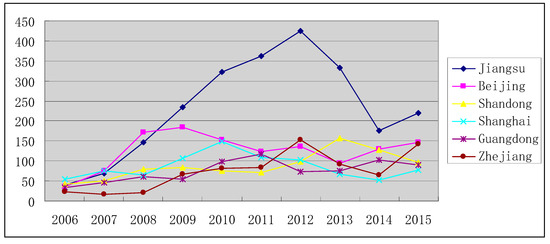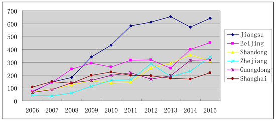 Figure 4 compares total patent applications for a selection of provinces in China which have showed significant levels of innovation. Jiangsu has the highest total number of patents, followed by Beijing and Shandong. Guangdong, Shanghai and Zhejiang have at least 1600 patent applications over the period (2006–2015).